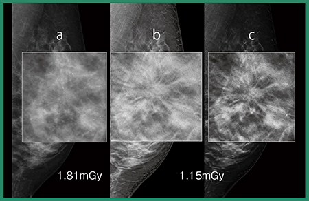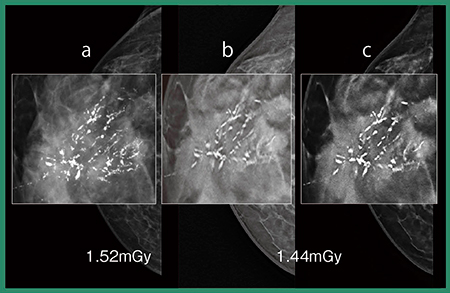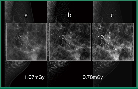 さらに,このS-View画像にExcellent-m 3Dを適用することで,画質の向上,線量の低減の可能性を期待して研究を行っている。図4は,ST-modeで撮影した非がん症例(石灰化)のS-View+Excellent-m 3D画像だが,ノイズやにじみが抑えられて,より診断しやすい画像が得られている。今後,症例を重ねて,画質や診療での使用方法について研究を進める予定である。S-View+DBTで診断可能との研究結果が出れば2D撮影が不要となり,現状の2D+DBTに比べ,約半分の線量で検査が可能となる。