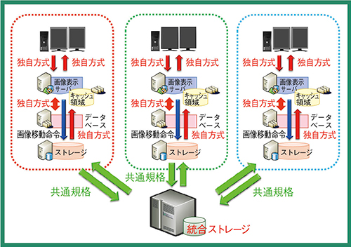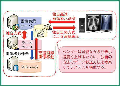 従来のPACSでは,表示速度向上のため,画像表示命令や圧縮方式などに各社が独自形式を採用していた(図1)。このため,システム更新で従来のような転送速度や高機能ビューワを引き続き利用するには,DICOM規格であっても同じベンダーに入れ替えるほかなく,結果的に“ベンダーロックイン”になっている。