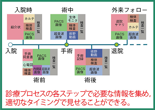 従来の病院情報システムは,電子カルテをはじめとしてPACSやRISなど部門システムが,相互に連携し情報をやりとりすることでスムーズな情報共有を可能にしていた。しかし,そのために各システムに情報が分散しており,1人の患者やあるイベントに必要な情報を集めるためには,手間と時間が必要となるのが現状である。われわれは,どのようなデータがどのタイミングで必要とされるかについて,PACSのログを取得し画像へのアクセス状況を解析することで検討を行った1)。その結果,キーとなるイベントに注目して関連性の高い画像をあらかじめ選択して表示できる可能性が示された。