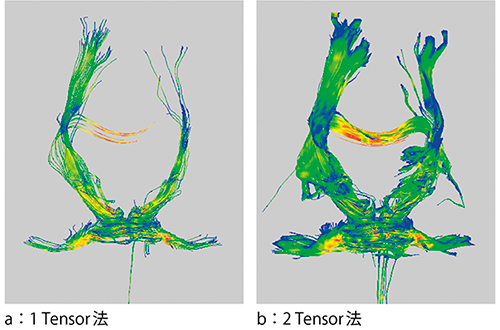 トラクトグラフィーの手法は,まず,複数DWIから得られたDTI画像から,Fractional Anisotropy(各軸方向の異方性,以下,FA)値を算出する。VINCENTでは,FA値および拡散方向から連続するボクセル同士を順次連結させて神経線維を描出するが,1ボクセルあたり1方向のみに異方性がある前提で計算する1Tensor法と,2方向に異方性がある2Tensor法のいずれかを選択できるようになっている(図1)。同一の始点ROIを設定した場合,1Tensor法と比較して,2Tensor法を用いることで全体的に描出される神経線維数は増加するが,トラクトグラフィーに要する時間は長くなる。利用用途に応じて,適宜手法を切り替えて解析できるようになっている。また,3D表示だけではなく,FA画像や拡散カラーマップの表示,指定ROI内の各種計測などの数値解析にも対応している(図2)。