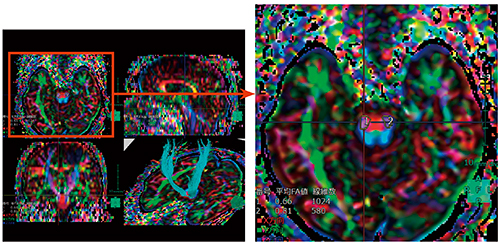 近年,モダリティのハードウェア,ソフトウェアの性能が向上したことにより,MRIでMotion Probing Gradient(以下,MPG)の方向を変えて収集した拡散強調画像(DWI)を短時間で収集することができるようになった。これらDWIをテンソル解析することで,拡散テンソル画像(DTI)の生成が可能となり,脳神経外科領域,神経放射線領域などで,さまざまな研究や臨床現場で利活用されている。その代表例として,トラクトグラフィーを用いた神経線維の三次元表示が挙げられる。ある脳神経病変部位と,錐体路をはじめとする神経線維との関係を観察することで,術前のシミュレーションや治療後のフォローアップに臨床応用されている。