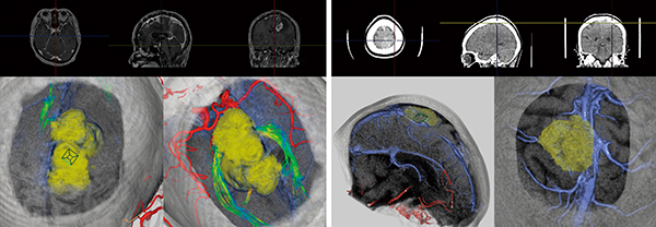 グリオーマ症例。骨切離後,脳表をクリップすることで,内部をあらゆる角度から観察できる。それぞれの臓器の透過度は自由に変更できる。