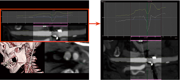 内頸動脈狭窄症は,食生活の変化などにより,わが国においても増加傾向を示している。2008年にCAS(Carotid Artery Stenting:頸動脈ステント)が認可されたことや,CT画像の画質向上などにより,血管撮影画像だけでなく,CT画像でも狭窄率の測定が積極的に行われるようになっている。VINCENTでは,血管CPR解析アプリケーションで,頸動脈狭窄症の外科的治療の指標となるNASCET計測が可能となった(図5)。内頸動脈遠位部と狭窄部を2点指定することで,値を算出することができる。また,NASCET法以外の狭窄率測定も前バージョンと同様に可能となっており,施設の運用に応じて,適宜使い分けることができるようになっている。