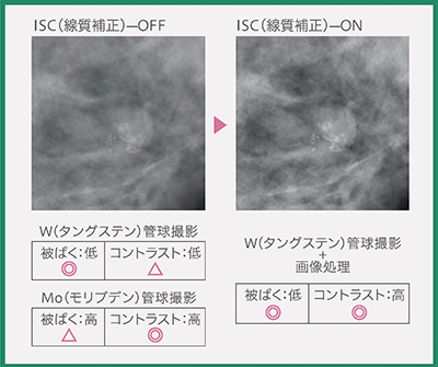 X線管球に透過力が大きいW(タングステン)陽極を使用することで,Mo(モリブデン)陽極での撮影に比べて被ばく線量を低減することが可能である。しかし,W陽極のマンモグラムはMo陽極で撮影されたマンモグラムに対してコントラストが低くなる問題がある。線質補正技術(ISC)とは,画像解析に基づいて被写体情報を把握し,乳腺/脂肪の量と圧迫厚,X線スペクトルの違いによって生じるコントラストの差を補正する技術である。この技術により,W陽極で撮影したマンモグラムでありながらMo陽極で撮影したマンモグラムと同等のコントラストを実現させている(図2)。