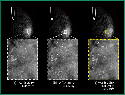 FSCの効果を図3に示す。従来処理画像(a)に対し30%の線量を低減した従来処理画像(b),30%の線量を低減したFSC処理画像(c)を比較する。FSC処理画像(c)は,30%の線量を低減しているにもかかわらず,従来線量(a)と同等の粒状性を示している。また,石灰化や乳腺に注目すると鮮鋭性およびコントラストの向上も確認できる。