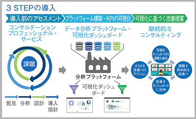 Applied Intelligence 医療データ分析サービスは,(1) 導入前のアセスメント,(2) プラットフォーム構築・KPI(Key Performance Indicator)の可視化,(3) 可視化に基づく改善提案,の3つのフェーズで進められる(図2)。まず,(1) 導入前のアセスメントでは,施設の課題,必要としている情報などをGE社とともに検討していく。その次に,(2) プラットフォーム構築・KPIの可視化として,データベースを基にしたデータ分析のプラットフォームを構築し,データを可視化するためのダッシュボードの設計をしてもらう。(3) 可視化に基づく改善提案では,ダッシュボードの情報から,課題解決に向けて施設が取り組むべき行動について,コンサルティングを受けながら実践していく。