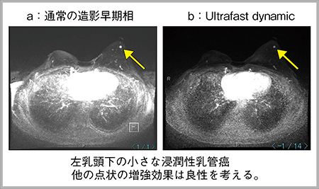 図1は,右乳がん部分切除後の症例で,造影早期相にて左乳頭下に微小な病変を認める(a←)。乳頭腫との鑑別が困難だが,Ultrafast Breast MRIの超早期相にて濃染を認め(図1 b←),多血性の腫瘍と考えられた。病理診断の結果,浸潤性乳管癌であった。