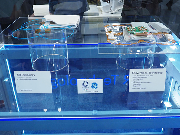 Edisonとともに,もう一つ同社のブースで注目を浴びていたのが,MRIの最新コイル技術“AIR Technology”である。歴史と実績のあるGEのMRIだが,開発陣の慧眼が,今までにない新しいコイルを創造したと言えるだろう。RSNA 2017で発表され,前回のITEMでも話題を呼んだAIR Technologyがいよいよ製品版として登場した。AIRとは,“Adaptive Imaging Receive”の略で,従来のコイルと比べて,“空気”を連想するような軽量化を実現している。開発に当たっては,素材など多くの技術を刷新。細くて柔軟性のとんだ“INCAワイヤ”や,省電力でシンプルな回路の“e-Modeプリアンプ”を採用した。