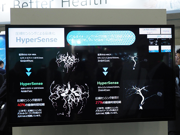 このほか会場には,日本国内薬事未承認の“Silent Scan”が体感できるコーナーが設置された。Silent Scanは撮像音を大幅に低減するだけでなく,TEによって水分子が広がることによる信号の低下を,TEを0にすることでなくす“0 TEイメージング技術”が採用されており,特にMRAの画質が大幅に向上する。従来のMRAではまったく改善できなかった部分であり,臨床稼働への期待は大きい。