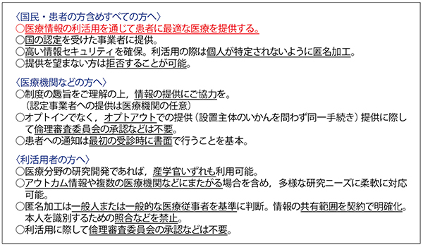 さらに,情報の利活用者には,医療分野の研究開発であれば主体を問わず利活用可能であること,アウトカムや複数の医療機関にまたがる利用価値の高い情報を利活用できること,匿名加工は一般人や一般的な医療従事者を基準に判断し,情報の共有範囲を契約で明確化して,特定の個人と識別できないようにすること,利活用に際して倫理審査委員会の承認などは不要であることを認識してもらうことも重要である。