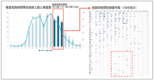 われわれは,Applied Intelligenceを用いて人員配置の適正化を検討した。昭和大学病院の放射線技術部には診療放射線技師が58名在籍している。従来,勤務シフトは1週間前にローテーション表を作成し,その上で当日の検査動向によりスタッフの配置を適宜変更していた。適正な人員配置に向けて,時間別検査数と検査実施時間別の診療放射線技師数のデータを抽出し,グラフ化すると,15〜17時において,診療放射線技師の人数が検査数を上回っていた(図1)。さらに,ドリルダウンして,15分単位での診療放射線技師別検査数を見てみるると,ほとんど検査を担当していない診療放射線技師がいることをわかった。このように検査数と検査実施診療放射線技師数を実施時間ごとに重ね合わせて見ることで,検査動向に合わせた人員数を把握し,人員配置やシフト調整に役立てられる。