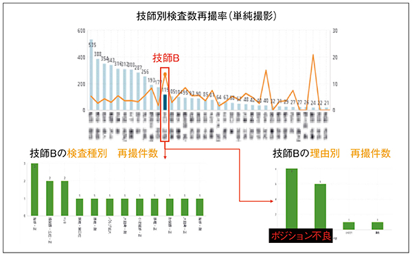 また,診療放射線技師の教育,人材育成にもApplied Intelligenceを活用した。従来,再撮影を行った場合,担当技師は紙の「再撮影報告書」に,撮影部位や原因などを記入している。その上で,全体のロス率を算出して,カンファレンスにおいて検討してきた。今回,Applied Intelligenceで診療放射線技師別に再撮影率を分析し,ドリルダウンして再撮影率の高いスタッフの検査種別再撮影率を見ると,特に胸腹部の撮影において再撮影が発生していた(図2)。さらに,再撮影の原因は,ポジション不良が多かった。この結果から,ポジショニングを指導すればよいことが示唆された。加えて,われわれは,人材育成に関し,「いつもどのような業務をしているのか」「次にどのモダリティの業務を習得すべきか」「どのような経験を積ませればよいか」について,Applied Intelligenceでの分析を行った。例えば,ある診療放射線技師のモダリティ別検査数でバラツキがあれば,今後は検査数が少ないモダリティを担当させるといったことが可能となる。このように,Applied Intelligenceは,診療放射線技師別の再撮影率や原因,モダリティ別検査数などを分析できるため,教育,人材育成にも有効活用できる。そして,これらの可視化されたデータから,スタッフの特性も踏まえた円滑なローテーションを組むことも可能である。