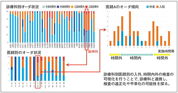 われわれは,実施した検査の入院・外来区分,時間内外についても可視化した。昭和大学病院はDPC参加病院であり,収益の観点からは外来での検査の施行が求められる。また,時間外の検査は人件費が増えるため,時間内で実施した方がよい。そこで,診療科別の検査数からドリルダウンして,医師別の検査オーダを分析し,さらに特定の医師の検査オーダの傾向を見た(図3)。このように,Applied Intelligenceで,診療科別,医師別に入院・外来,時間内外の検査を可視化することにより,各科と連携して検査の適正化や平準化を図れる。