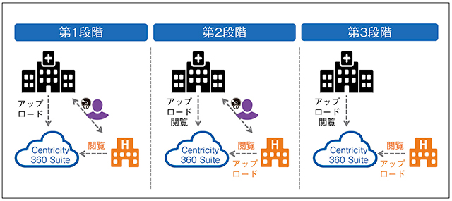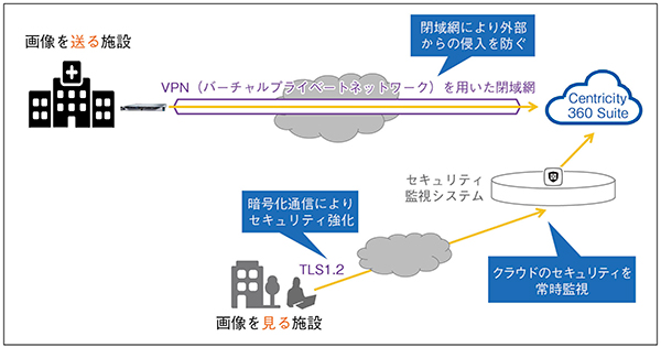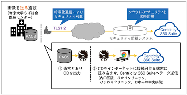 パイロット運用は,従来の運用との差を見るために,以下の3段階で行う予定である(図1)。まず第1段階として,当院から連携先施設に画像を送る場合,PACSのデータを直接Centricity 360 Suiteに送信せずにCDを用いる。放射線部がPACSにあるデータから従来どおりCDを出力し,それをインターネット接続可能なPCで読み込み,Centricity 360 Suiteにアップロードしている(図2)。インターネットを通じたデータの送信には,利便性の観点から,高いセキュリティを担保できる通信プロトコルTLS1.2を用いた。また,クラウドセキュリティ監視システムが常時監視しており,強固なセキュリティを確保した(図3)。患者のデータがCentricity 360 Suiteにアップロードされると,連携先施設には通知が送られ閲覧可能となる。また,CDも連携先施設に届けられる。次の第2段階では,連携先施設もCDの出力とCentricity 360 Suiteへの画像送信を行い,双方向での情報共有を行う。さらに,第3段階では,CDの運用を廃してCentricity 360 Suiteだけとする。
