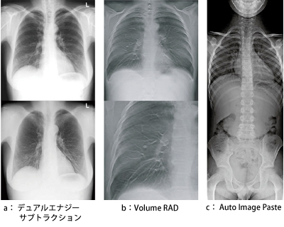 GEは今回,最新の一般撮影フラグシップモデル「Discovery XR656」で初めてFlashPadを搭載,“デュアルエナジーサブトラクション”(図2 a),“Volume RAD”(トモシンセシス,図2 b),“Auto Image Paste”(長尺撮影,図2 c)の3つのアドバンスドアプリケーションに対応できる性能を持たせた。基本性能として,200μmピクセル,CsI間接変換方式,1枚成型という特長を備え,1照射の線量が少ない場合でも,低ノイズ画像データが取得できるよう,“低線量&高DQE”のコンセプトも兼ね備えている。また,マルチフレームイメージング技術を採用し,すべてのアプリケーションで200μmピクセルビニングなしのままで,2022×2022×14ビットのピクセルデータを読み取り可能にし,臨床での応用範囲を拡大することに成功した。
