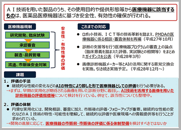 AIを用いて診断,治療などの支援を行うプログラムは,医師法第17条で規定されている「医師でなければ,医業をなしてはならない」との関係を明確化する必要がある。厚生労働省では,2018年12月に「人工知能(AI)を用いた診断,治療等の支援を行うプログラムの利用と医師法第17条の規定との関係について」(医政医発1219第1号)を発出した。本通知では,診断,治療などを行う主体は医師であり,最終的な判断の責任を負うこととしている。したがって,AIを用いたプログラムは,医師の診断ツールという位置づけになっている。