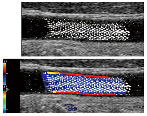 下段:カラードプラ表示に加えた速度ベクトルとWSS