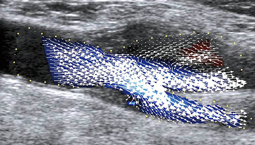 VFM Vascularの実際の画像を見ると,分岐部血流(図2)や複雑な血流(図3),内頸動脈プラーク壁にかかるWSSが血流のベクトルとともに可視化されている(図4)。WSSの数値化も可能なため,血流が局在するプラークに与える影響をWSSとして定量化できると考えている。