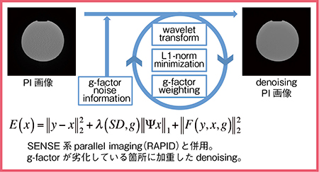 INRは,PI画像に後処理にてg-factorとノイズの情報を加味し,wavelet変換とL1-norm最小化による最適化を行うことでPI画像のノイズを除去する技術である(図5)。SENSE系のPI(RAPID)との併用が可能であり,g-factorが劣化している箇所に荷重したノイズ除去を行う。また,INRは,SE系シーケンスやGRE系シーケンス,さらにはSE-EPI,GRE-EPI,拡散強調画像(DWI)などの2Dシーケンスに適用可能である。特に,DWIでは,検査の高速化と定量値の安定化が期待できる。