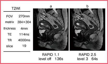 症例3は,子宮体がんのT2強調画像である(図6)。RAPID 1.1・INRレベルoffの画像(図6 a)と比較し,RAPID 2.5・INRレベル3の画像(図6 b)では,半分の撮像時間(約1分)で同等の画像が得られている。むしろ,撮像時間を短縮したことで腸の蠕動によるアーチファクトが低減し,病変の辺縁の描出能が向上している。