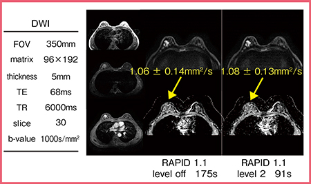 症例4は,乳管癌のDWIである(図7)。Rapid 1.1・INRレベルoffの画像と比較し,加算回数を半分にして撮像時間を約3分から1分半に短縮しても,INRを適用することでほぼ同等の画質が得られている。なお,低SNRのデータにINR処理を行うと,線状のアーチファクトが見られることがある。本症例では問題ないが,今後の改善に期待したい。