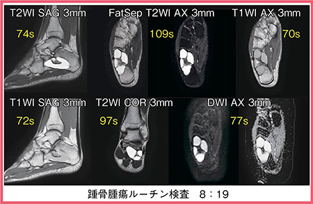 症例5は,踵骨腫瘍ルーチン検査で,すべて3mmスライス厚で撮像しているにもかかわらず,8分19秒で検査が終了している(図8)。INRを適用する際には専用コイルを使用するが,それによって撮像時間をここまで絞っても臨床に堪えうる画像が得られる。