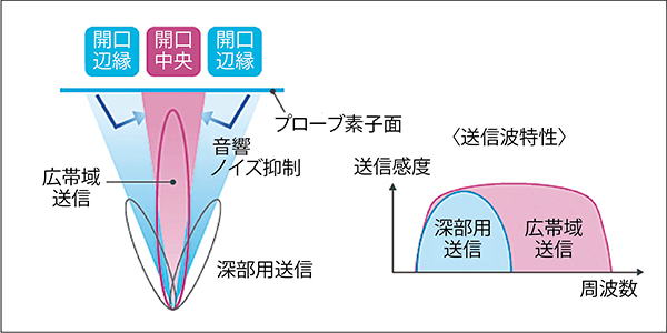 浅部から深部の描出能をより向上させるため,Dual Sonic技術を搭載した。従来は,開口内すべての素子に同一の送信波形を入力していたが,本技術では,送信開口を中央部と辺縁部に分割し,開口中央部では独自の3周波混合送受信技術(Triad Tissue Harmonic Imaging)を使った広帯域の送信波形,辺縁部では深部で有効に働く低周波成分を多く含む深部用の送信波形を使用した(図2)。2種類の送信波形により最適な超音波ビームを形成することで,浅部領域での音響ノイズ混入を抑制し,高い分解能を実現するとともに,送受信効率の最大化により,深部の描出能向上も同時に達成した。