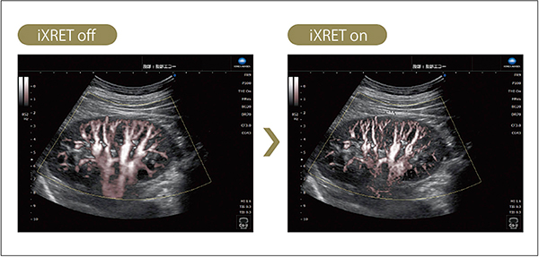 フレームレートを維持しながら分解能を向上する技術として,iXRET(eXtended Resolution Enhancement Technology)を搭載した。機械学習を活用して構築した独自の画像処理技術により,従来のリアルタイム性能向上技術では課題となっていたアーチファクトを抑えながら,少ない音響線数で取得された超音波画像の解像度向上を実現した。iXRETは,Bモード画像とカラードプラ画像の両方に適用可能であり,特にカラードプラ画像では,ノイズと血流の判別能が上がり,微細な血流の視認性が向上した画像を提供可能となった(図3)。