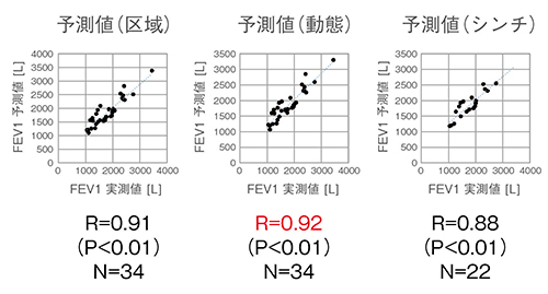 X線動態画像で得られた血流分布を利用した術後予測FEV1は,実測値と高い相関が見られた。ただし,3つの手法の予測精度に大きな差は見られず,これは対象症例の血流分布のバラツキが小さかったためと想定された。