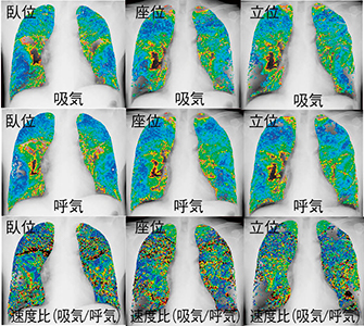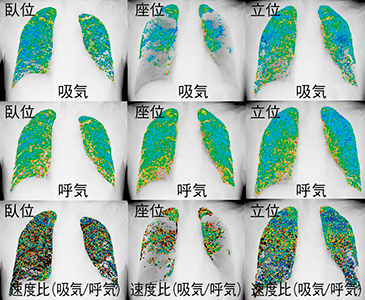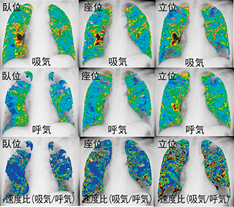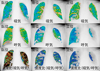 胸部X線動態画像による換気能評価では,左肺の換気量が低下しているが,下葉の病変はそれほど強くなく,体位による変化もほぼ認めなかった(図1)。次に,気流速度解析画像は,呼気速度,吸気速度,速度比(吸気・呼気)を色分けし,画像に重ねて表示する。速度に応じて赤(高速)〜青(低速)とし,速度比については赤・黒(高速)〜青(低速)としている。データ欠損部分は空白となる。本症例の安静呼吸時の速度比は,立位と比べて臥位で亢進しており(図2),深呼吸時にはさらに亢進していた(図3)。