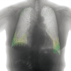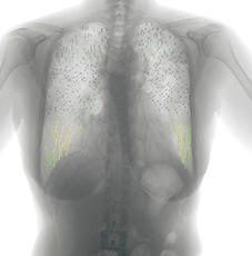 胸部単純X線写真では,上肺野優位の網状影,浸潤影が認められる。単純CT画像(図4)では,上肺野に強い網状影とコンソリデーションが認められた。胸部X線動態画像(図5)では全体的に動きが悪く,横隔膜の動きも不自然で,側面像では肺の下葉が呼吸を支えているという印象である。変位のベクトル表示画像(図6)でも肺野全体の動きが悪い印象であった。