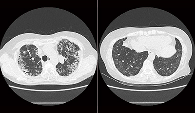 症例1は,68歳,女性,下肺野優位のIPである。2018年9月から咳嗽が出現し,12月に近医にてIPを指摘され,2019年1月に当科を受診した。現在,無治療経過観察中。元喫煙者(20本/日×30年)で,既往歴は腎疾患,虫垂炎,子宮付属器炎,静脈瘤である。血液検査の結果は,抗核抗体(ANA):640倍,抗セントロメア抗体:陽性,KL-6:1082U/mL,SP-D:362.1ng/mLであり,また,呼吸機能検査の結果は,肺活量(VC,%VC):2.19Lの88.2%,肺拡散能力(%DLCO):71.9%であった。