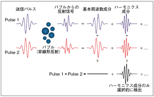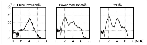 PMPI法は,基本周波数帯域に加え,ハーモニクス成分でもバブルからの反射信号を効率良く検出可能である(PM法は減算するためハーモニクス成分が減少)(図2)。これにより,PM法のメリットである感度に加え,空間分解能の向上が期待できる。