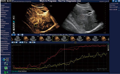 造影超音波画像の定量解析でポピュラーな方法の1つに,経時的輝度回復曲線(time intensity curve:TIC)を求める方法がある。QLABのROI機能を用いることで,造影直後に装置上で簡単にTICを表示可能である。さらに,動きによる補正(Motion Compensation)が可能で,患者さんに負担をかけることなく再現性の良い解析が可能である。種々のカーブフィッティングにも対応しており,さまざまなニーズに合わせた近似曲線の表示が可能である。