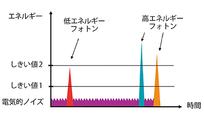 X線光子1つが検出器に入射すると,そのエネルギーに応じた高さの電気パルスが1つ発生します(図2)。その数をカウントすることで,AD変換を用いず,直接デジタル信号を取り出します。従来システムでの課題だった,画像形成の過程で発生するノイズを抑制することで高いX線検出効率を実現した,次世代の検出技術です。
