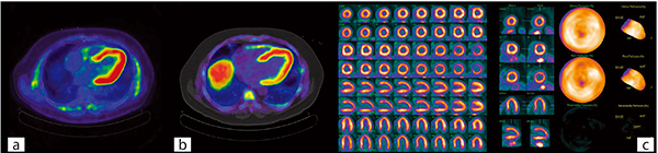 18F-FDGの集積(a),13N-ammoniaの集積(b),82Rb-chlorideによるパフュージョン解析の例(c)。