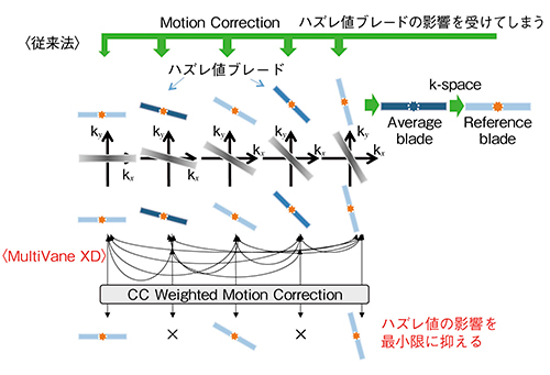 PROPELLER法は,ブレード内のデータ収集と,それを繰り返し時間ごとに回転してk-spaceを埋める方法である。従来法はすべてのブレードを足し合わせた平均値をリファレンスデータとして,動きの影響があるブレードを省き体動補正を行っていたが,本手法ではリファレンスデータ自体に動きの影響を受けたデータが含まれるため,体動補正の精度が落ちてしまう。MV XDでは,リファレンスデータを作成せずすべてのブレード同士でパラレルに比較していき,基準以上の動きが出たデータを省くため,より高い精度での体動補正が可能となった。これにより,スライス面内の補正のみならず,スライス方向に対しても体動の影響が大きいブレードは再構成から省くため,アーチファクトを最小限にすることが可能となった(図1)。また,parallel imaging法の併用が可能となったことでルーチン検査時間からの延長を大幅に低減することができ,fast field echo(以下,FFE)法への適用も可能となったことで,腹部でのシーケンス適用も行えることとなった。