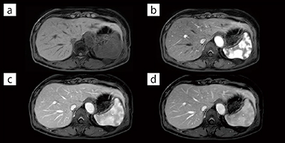 k-spaceのセグメンテーションを行うことで,空間飽和パルスを利用可能となり,大動脈からの血流アーチファクトを抑制可能である。(a)ダイナミックプレ画像(b)肝早期相(c)門脈相(d)平衡相である。