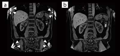 3D B0なし(a)に比べ3D B0補正あり(b)は,full FOV撮像においてストップバンドアーチファクトを低減することが可能である。