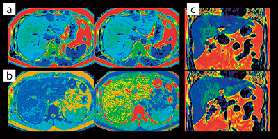 脂肪肝におけるfat fractionマップ画像(a),R2*マップ画像(b),fat fractionマップ画像からMPR処理を行い冠状断で再構成した画像(c)を示す。各画像をカラー表示することで病変を視覚的にとらえやすくすることが可能である。