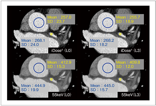 逐次近似応用再構成法iDose4と仮想単色X線画像の55keVを比較しても,55keVの画像は造影効果が増強し(CT値の上昇),コントラストが最適化され,さらにSDも改善された画質となっており,少ない造影剤使用量で従来のCT画像から大幅に改善した画像で診断が可能である(図5)。