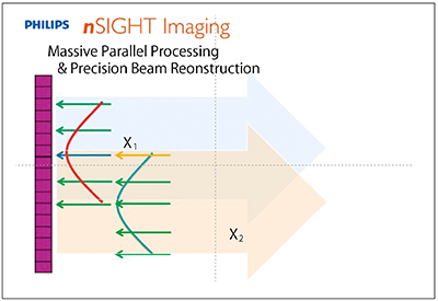 ここで登場したのが,“nSIGHTイメージング”である。これは,ビームを絞らない状態で送信を行い,対象領域全体から受信を行う技術がベースである。大量のメモリと超高速の並列処理を行うnSIGHTイメージングでは,1送信あたり10本以上の受信音線を構築できるまでになった(図3)。これにより,3D超音波もフレームレートの低下を最低限に抑えることが可能となり,さらに,送信波を一部分重ね合わせることにより,処理時間を落とさずに音線単位での受信感度を向上させることも可能となった。