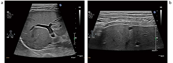 b:深さ4cm。肝表面における多重反射の影響が少なく,シストも認識しやすい。