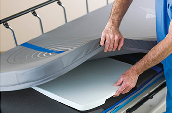 AI Breastでは,「超音波診断装置がトランスジューサの位置をリアルタイムで認識する」。これは,マットレスに内蔵された磁場発生装置「テーブルトップ型フィールドジェネレーター」(図3)とeL18-4に内蔵されたセンサである「電磁トラッキングコイル」により実現されている。従来の乳腺エコーの検査ワークフローを極力妨げずに,AI Breast機能が活用可能である。代表的な機能は下記である(図4)。