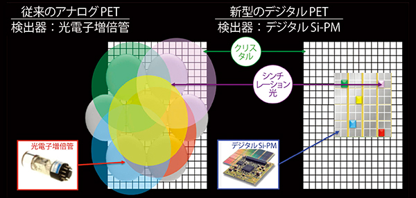 一方,デジタルフォトンカウンティング技術(図2)では,1つのクリスタル4×4mm2あたり3200個のデジタル半導体素子が,シンチレーション光を増幅することなく直接デジタル値としてカウントし,高速にイベントを処理することでアナログ由来のノイズを排除し,理想的なデジタル信号を検出する。結果として優れた温度特性とシステムの直線性を達成した。