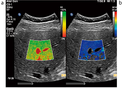図2 ElastQ Confidence Map(a)とStiffness Map(b)