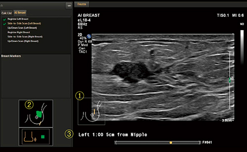 “AI Breast”は,マットレスに内蔵された磁場発生装置でプローブの位置を自動検出し,画像データと一緒に保存する機能である(図3)。従来,手動で合わせる必要のあったプローブマークが追従するため,より正確なプローブ位置を自動で残すことができる。また,スキャンした軌跡が表示・保存されるので,データの客観性が向上し,スキャン技術の向上にもつながる。さらに,ワンボタンで病変の乳頭からの方向と距離を計測し表示することも可能であり,術前化学療法後の病巣部位の同定などに活躍が期待される。
