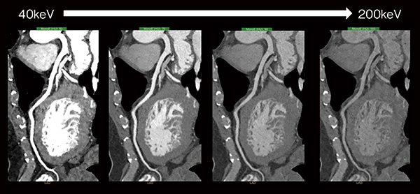 現在の単一管電圧から発生したX線によるsingle energy CT(以下,SECT)は,検出器の多列化,撮影速度の高速化により,広く循環器領域に用いられている。しかし,多様な組織が組み合わさり成り立っている人体に対して,CT値の情報を取得するために,異なる物質であってもCT値が近い場合にコントラストが同様になる場合や,同一の物質でも密度の違いによりCT値が異なるなどの課題がある。また,腎機能低下により造影剤の減量を必要とする症例では,120kVpより低い管電圧で撮影することで造影コントラストは向上するものの,ノイズの増加が顕著となり明らかな診断能の低下を認める。