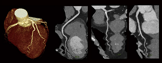 一般的に,SECTにおける心臓CTは,冠動脈評価において陰性的中率の高さから,冠動脈狭窄を除外する診断ツールとして有用である2)。冠動脈評価の診断精度を高くするには,造影剤による高いコントラストで冠動脈内腔が明瞭に描出される必要がある。しかし,日常の検査対象の割合は高齢者が多く,腎機能低下した症例も少なくない。このような症例には,造影剤を低減した低侵襲な検査が望まれる。