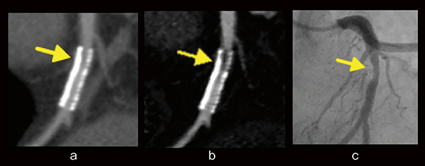 IQonにおける仮想単色X線(以下,MonoE)を用いた画像は,エネルギーを40keVから200keVまで連続的に可変して表示することができる。また,上記のanti-correlated noiseを除去することで,低いエネルギーのMonoE画像(以下,MonoE低keV画像)において,造影剤投与量を低減しても高画質で観察が可能となる。図3の腎機能低下症例では,造影剤を大幅に低減し,MonoE低keV画像を使用することで,低侵襲で診断能の高い検査が可能となっている。また,物質弁別を用いたヨード密度強調画像(以下,Iodine no water)では,ヨード造影剤のコントラストを強調することにより造影効果を有する箇所はさらに視認性が増し,従来のSECTでは診断困難なステント内再狭窄症例における低吸収プラークの視認性向上が期待できる(図4)。